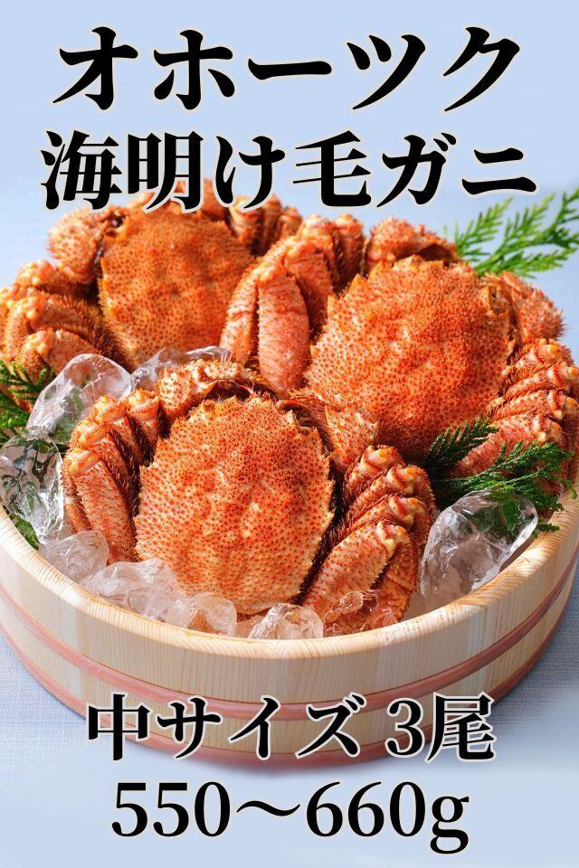 【クール冷蔵】 北海道オホーツクの毛ガニ 中サイズ(550~660g) 3尾セット 雄武沖で捕れた黒ラベル50